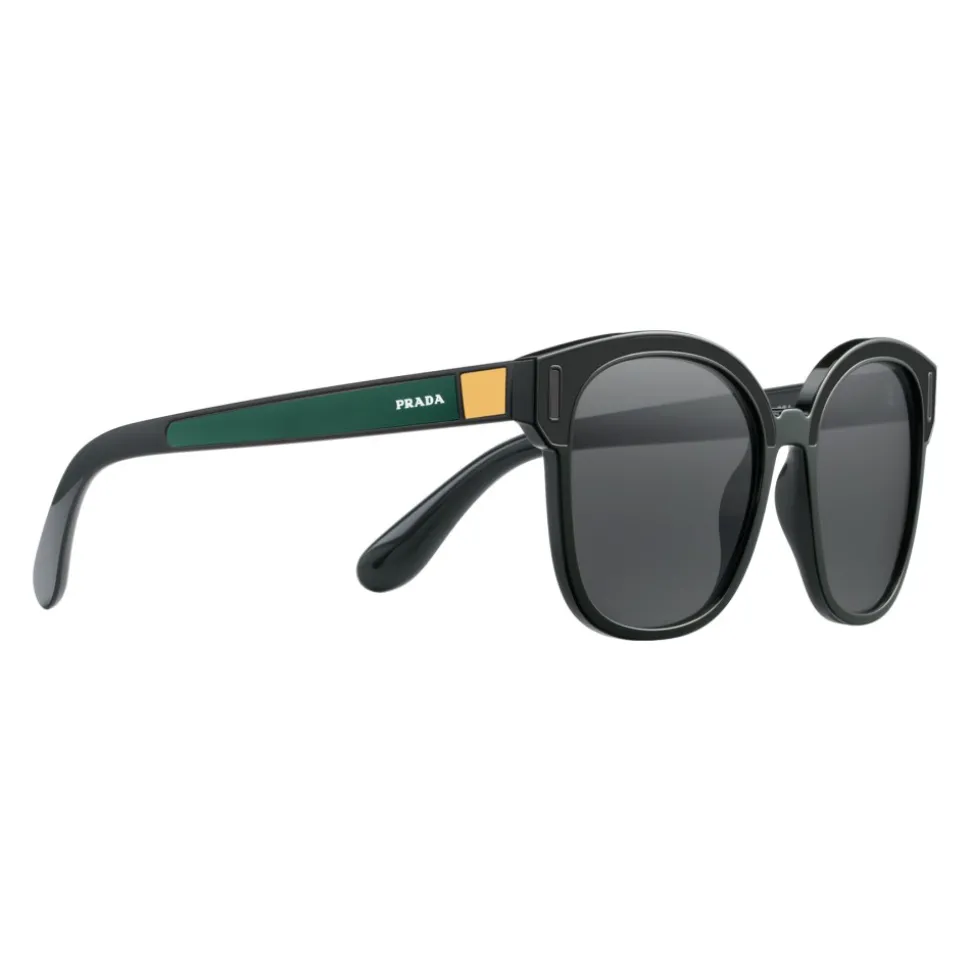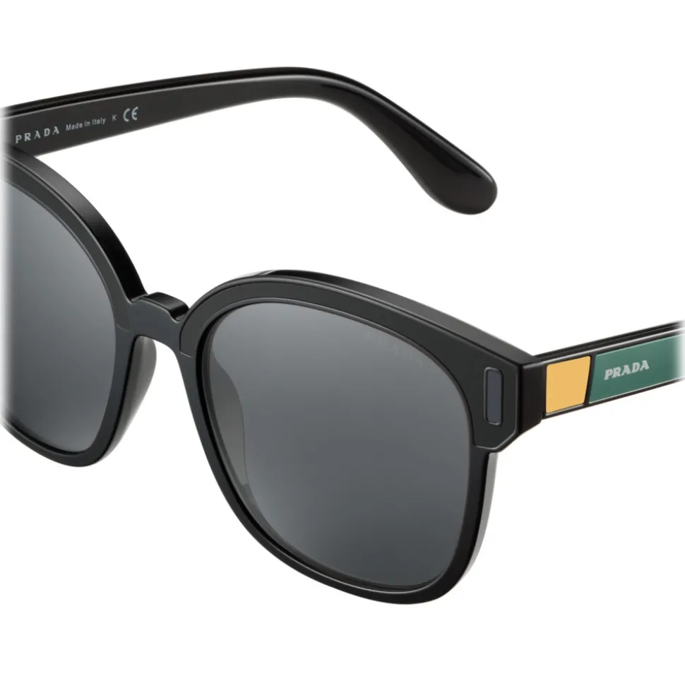 Female silhouette with a wide and squared shape enriched by the application of distinctive inserts in colored acetate with “pop” colors. Logo Prada Lettering.