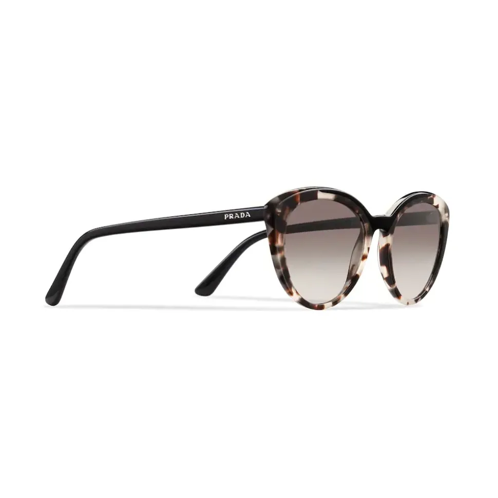 Sunglasses from the Prada Ultravox collection. Feminine cat-eye silhouette with soft, rounded lines. Distinctive colored acetate inserts on the frame front. Prada lettering logo.