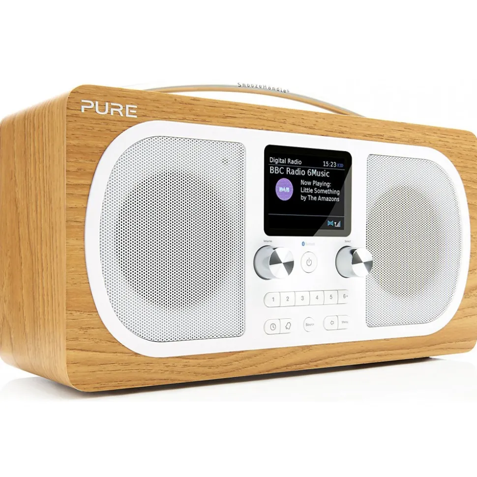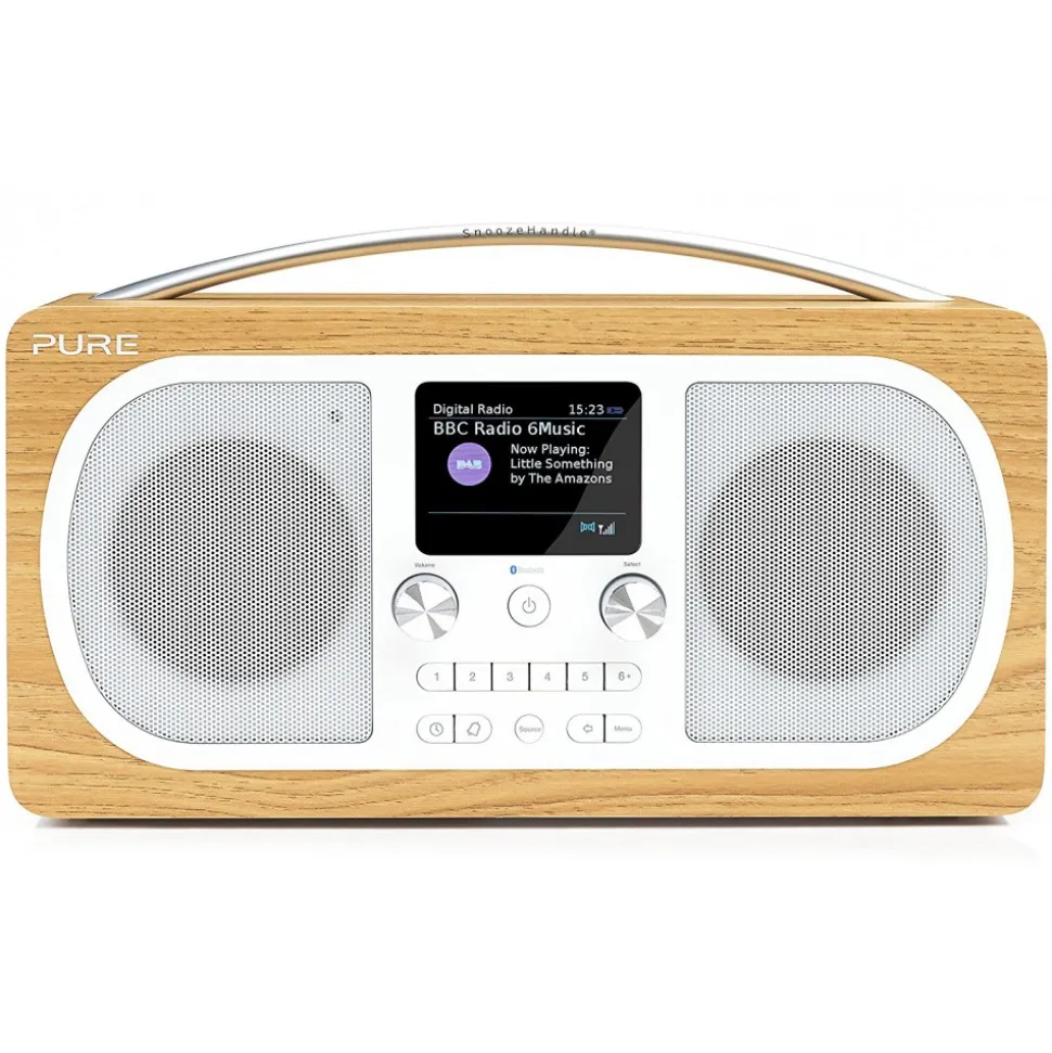 Evoke H6 combines the best of digital radio with wireless music streaming in superior stereo sound. Bluetooth connectivity and the latest in advanced audio technology from Pure will bring a new level of enjoyment to your device’s music and applications. The large, ultra-clear screen allows you to view radio programme information and artwork in full colour. Evoke H6 is available in a classic oak finish.