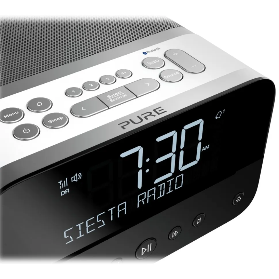 Siesta Home’s CrystalVue + display with automatic brightness control, shows the time and information about the station in a large, clear, ultra-sharp and unframed format. These features are combined with the backlit buttons dedicated to preset stations, alarms and much more, making the Siesta Home navigation simple even in the darkest environments.