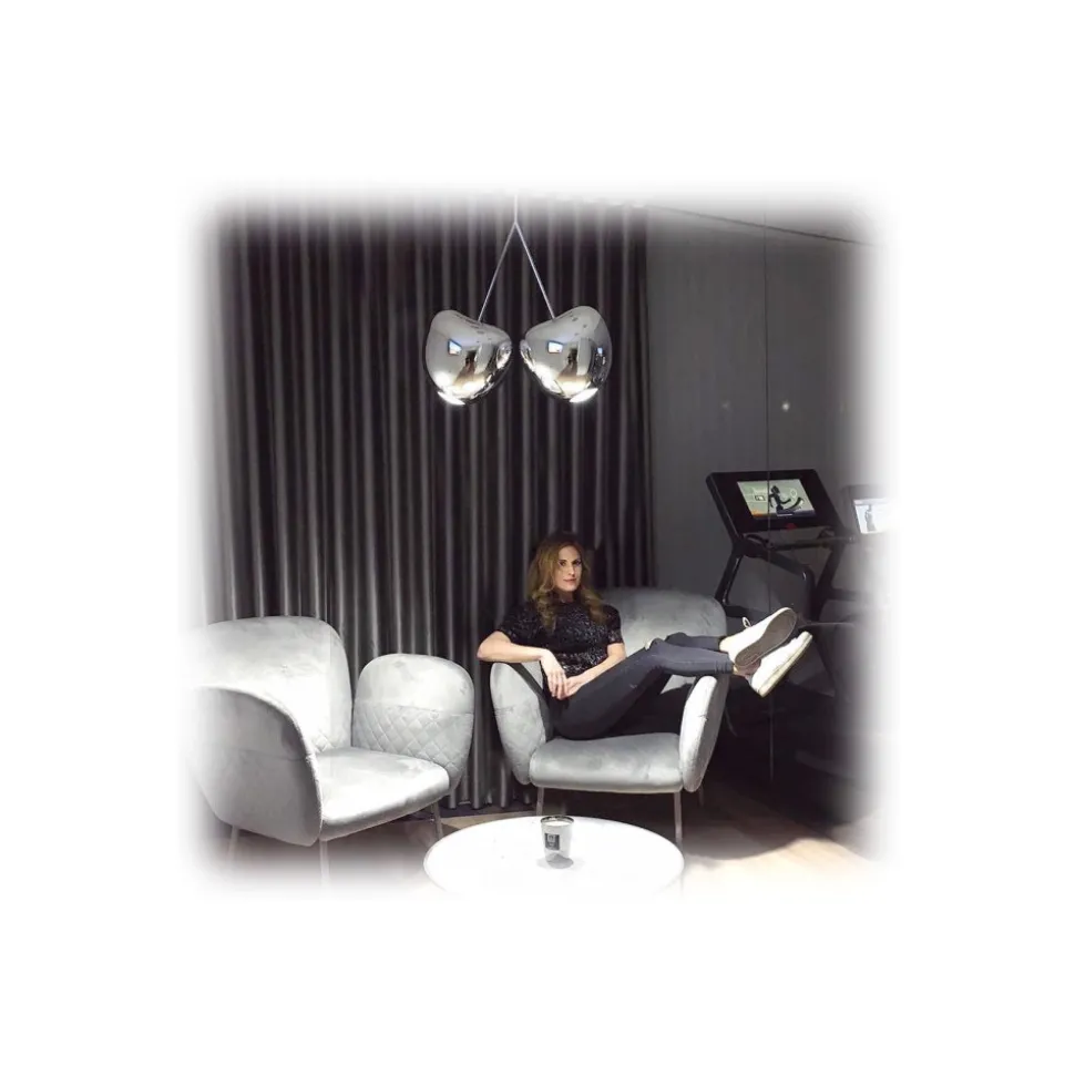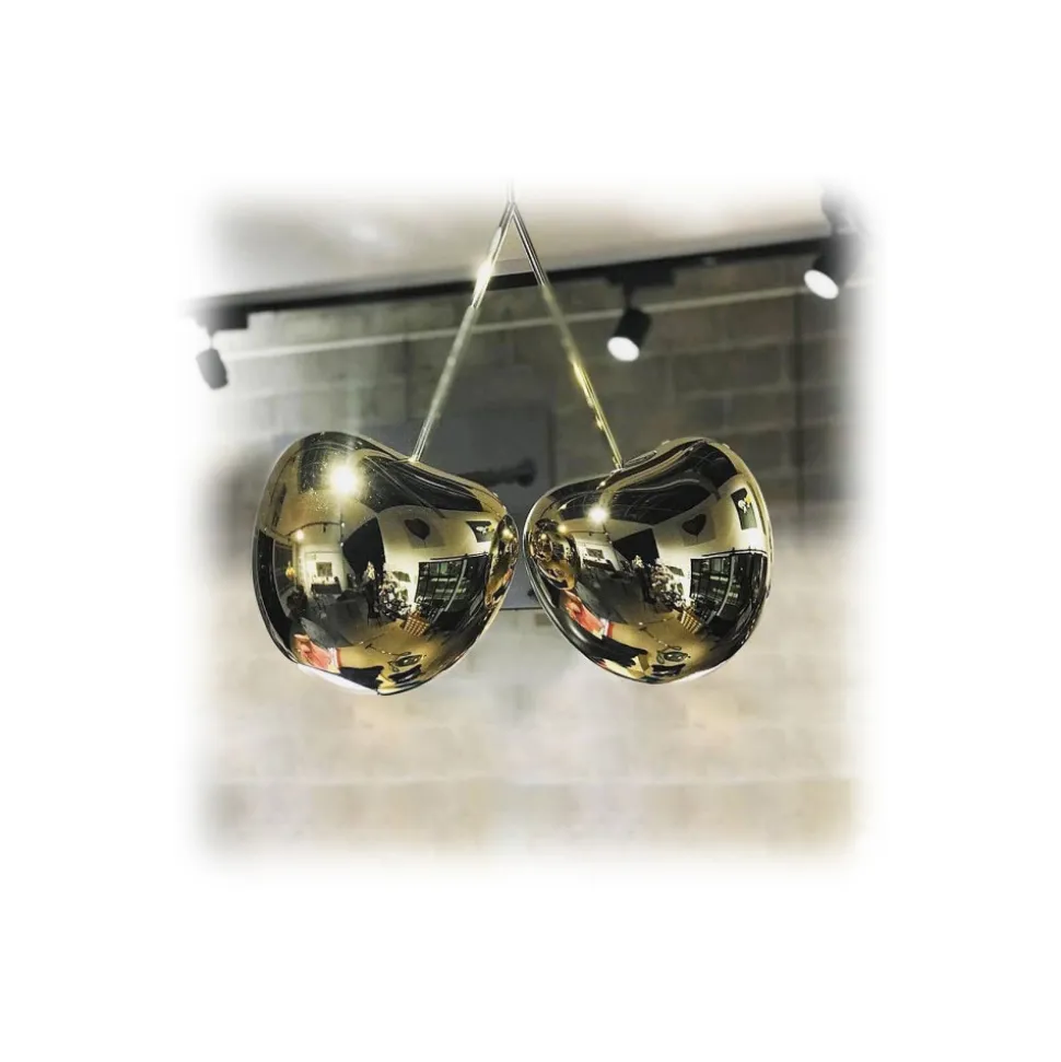 Hanging from the ceiling, the lamp blinks at the concept of desire: its attractive and plumpy shapes, the ability to reflect what’s around in the glam version/gold, suggesting the instinct of a natural gesture to pick the fruit from the tree.