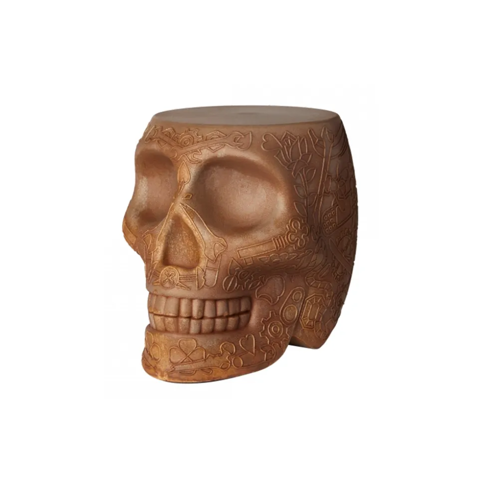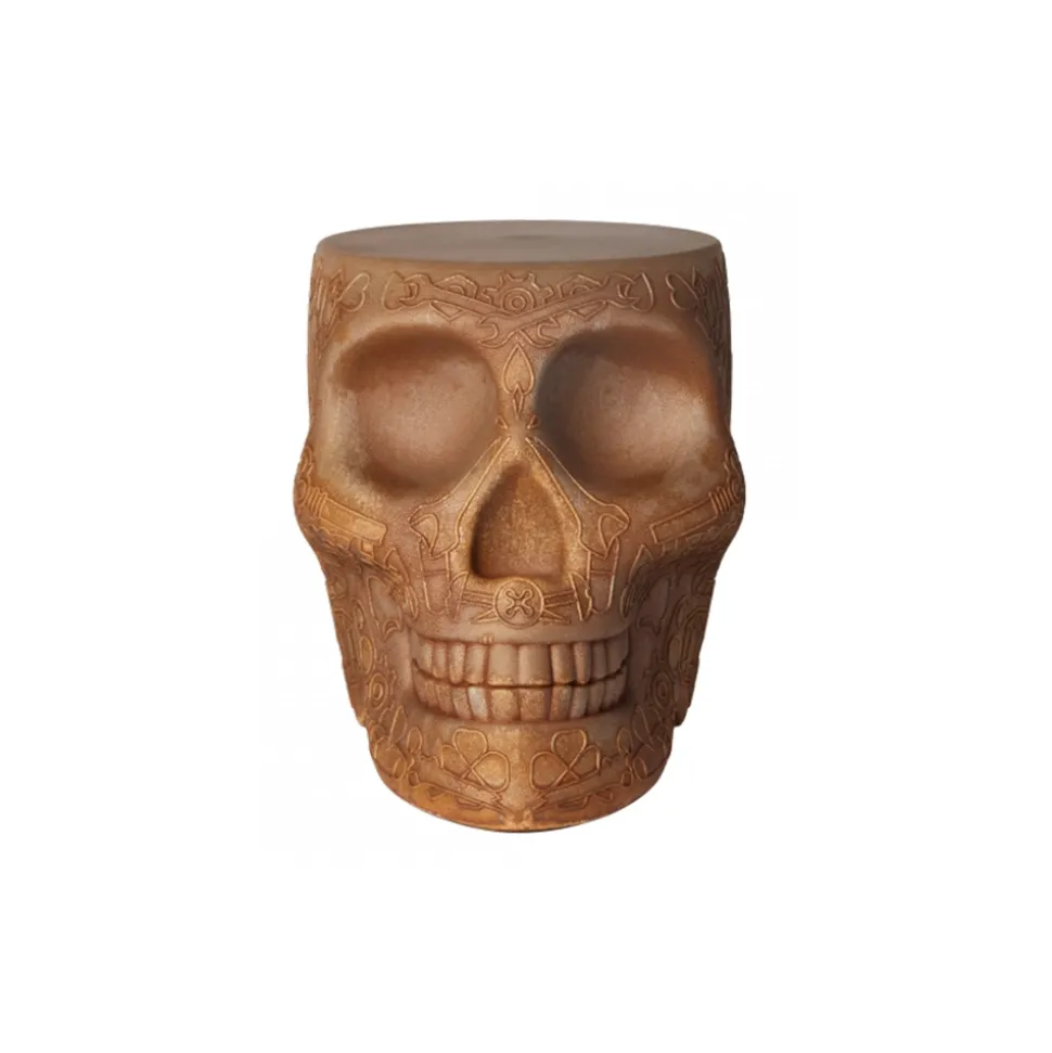 Decorated with the graphic pattern of the Mexican skull, a symbol created to exorcise death and celebrate life, it becomes an extravagant stool/table with a rigid top.