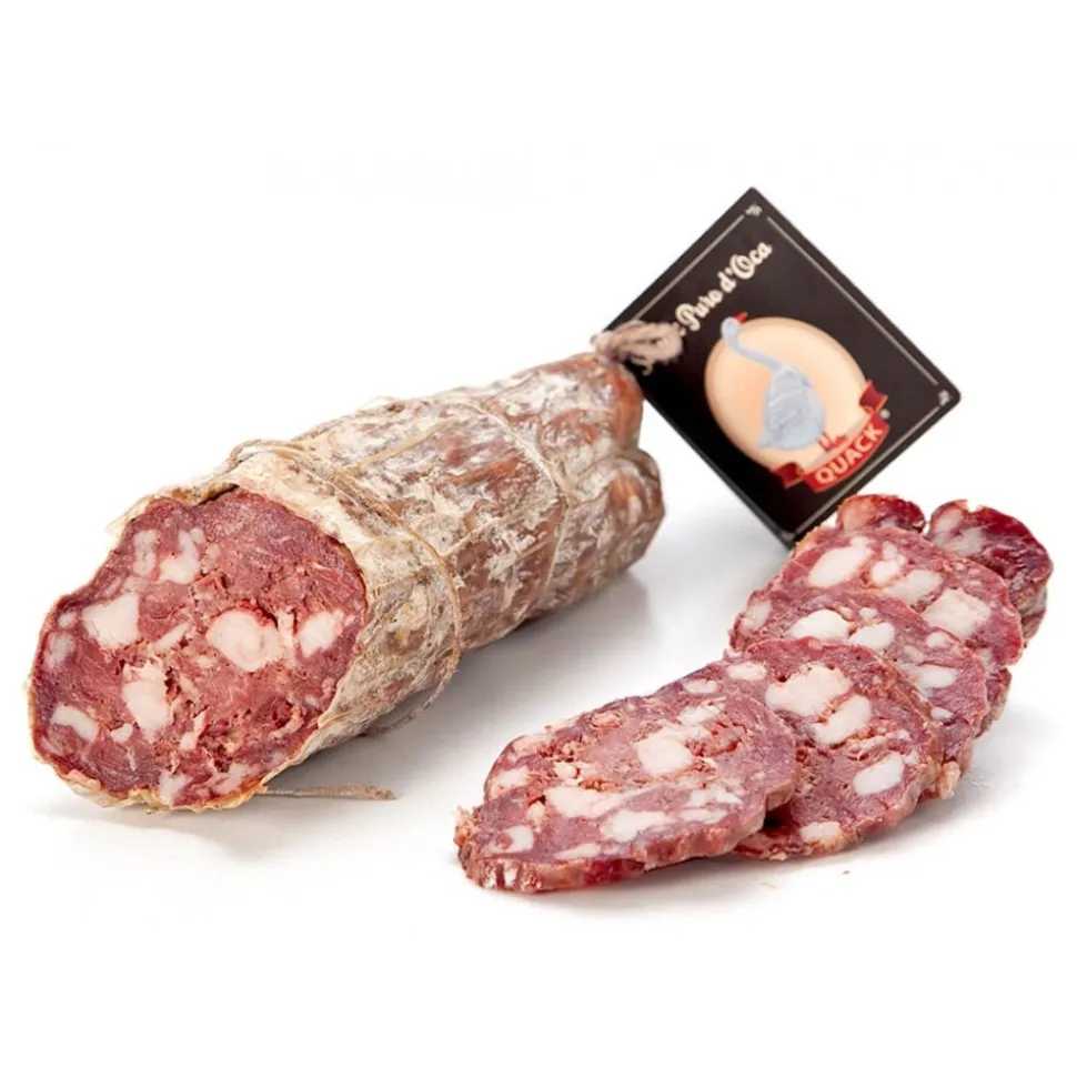 Quackâ pure goose salami is made of 100% goose meat with the sole addition of salt and natural spices, without any addition of preservatives or chemicals.