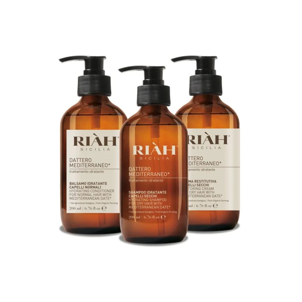 Ideal treatment for all hair types, and in particular for those who want new brightness and softness to the hair. Correct hydration allows for healthy, strong and shiny hair. The package offers a moisturizing shampoo also suitable for frequent use that gently cleanses without weighing the hair down. To complete the treatment, you can then alternate the moisturizing balm for a detangling action, or a cream for a more emollient and nourishing pack. All products contain Mediterranean date oil, a valuable nutrient extracted from the seeds of the fruit.