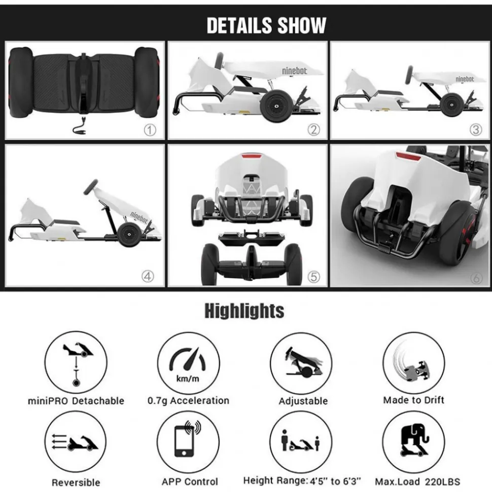 Ninebot Gokart is the first Gokart tested for adrift rates. In addition to the brake pedal, the Ninebot Gokart is equipped with a mechanical handbrake that allows not only to stop the vehicle abruptly, but even to drift. The more you run, the more you can challenge yourself. Enjoy the race with initial acceleration and sprint from 0 to 20 km / h in a few seconds. The adjustable frame and wheels various driving sizes from 130 to 190 cm and a maximum load of 100 kg. Use the Segway-Ninebot App to connect your smartphone with your vehicle to measure your performance, driving mode and use many other features.