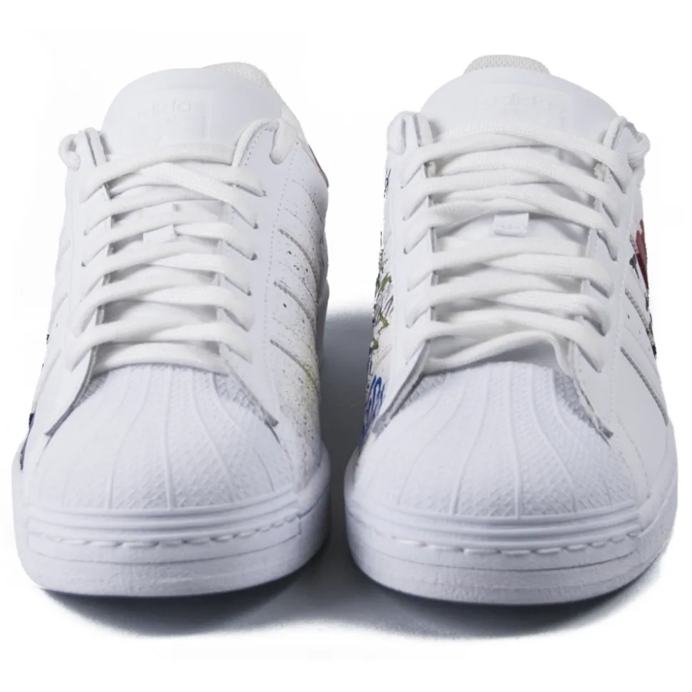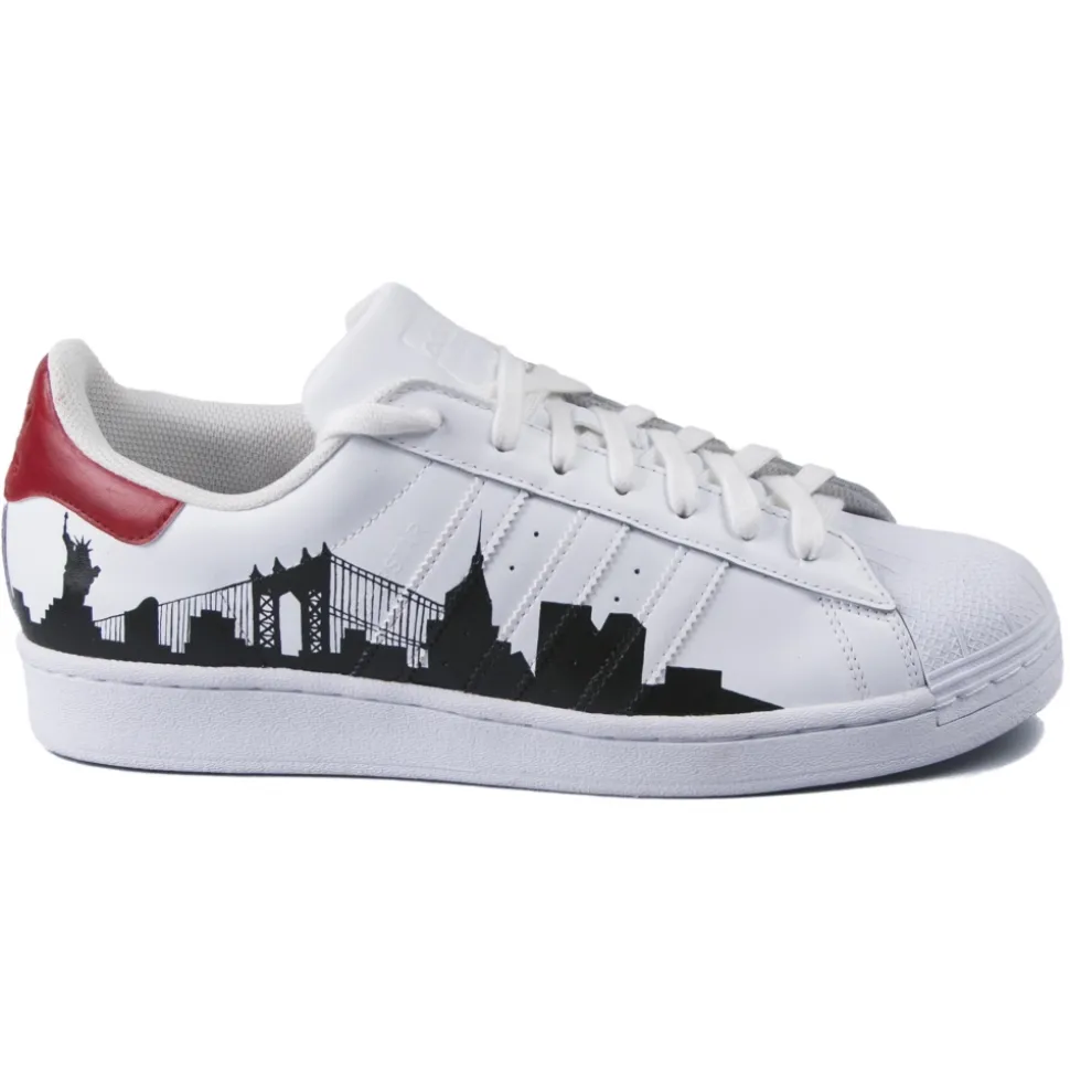 The iconic design combined with the hand painted Manhattan skyline and the colorful graffiti tags makes this pair of shoes a unique artwork to wear.