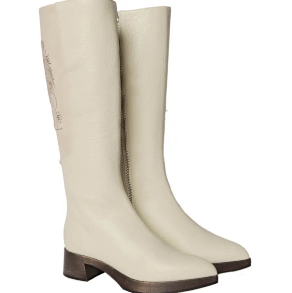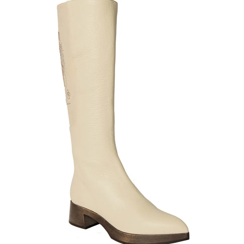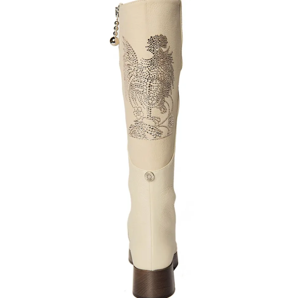 High boots made of beige sof bovine leather, lining is in nude calf leather, the bootleg is with beige rhinestone Gallo (rooster) on nabuk leather, beechwooden dark brown waxed sole with heel high 30 mm. Made in Italy.