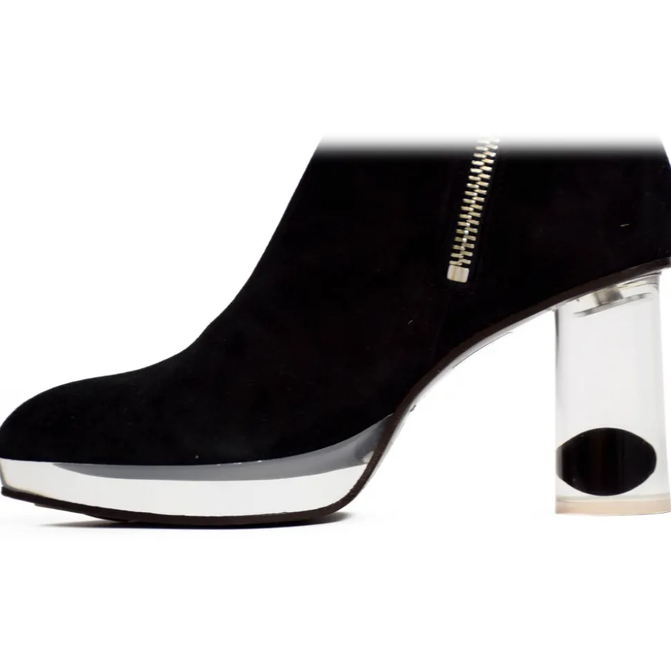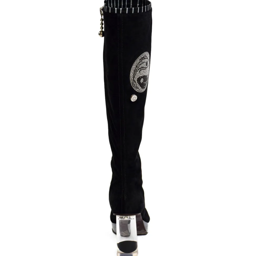 Black suede boots with Yin&Yang moeve printed on white strass of the boot-legs, lining in black and greystriped satin, lateral metal zip with spherical zippuller, plateau and heels are of transparent plexi, 70 mm heels are with englobed black spheres, soles are in brown leather. Made in Italy.
