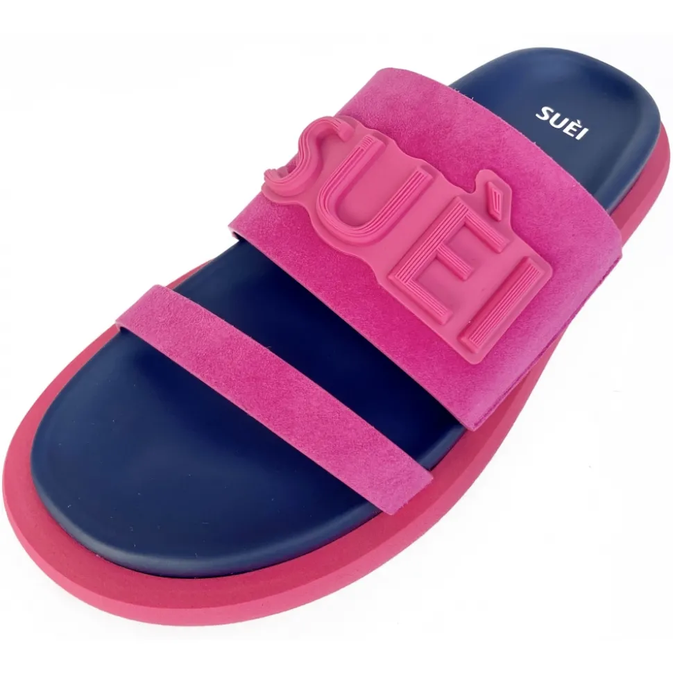 Slippers of fussbed structure made of suede leather color Fuxia with rubber/silicon patch SUÈI, leather lining color Blue. Soles in micro color Fuxia. Made in Italy.