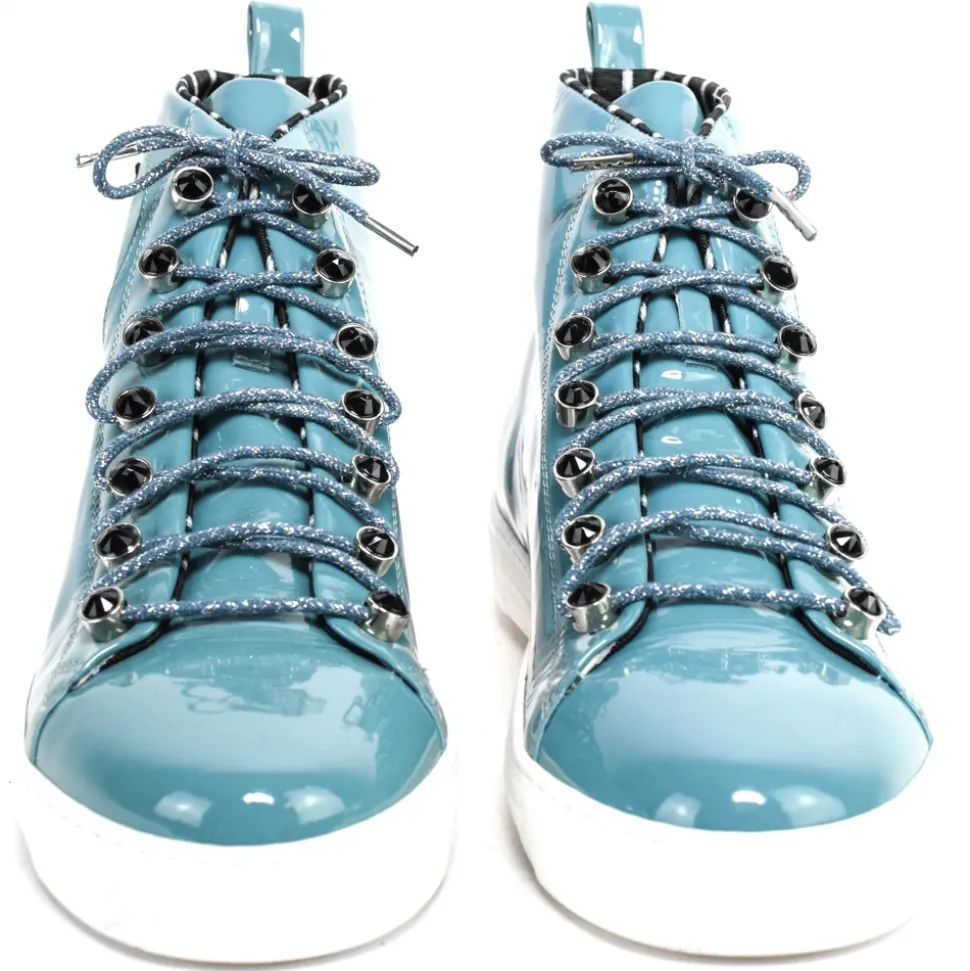 Sneakers made of patent leather color Turchese with patch Snake, satin lining styled with black/grey stripes, eyelets with artificial stones color Black, white rubber soles. All materials and production: Italy.