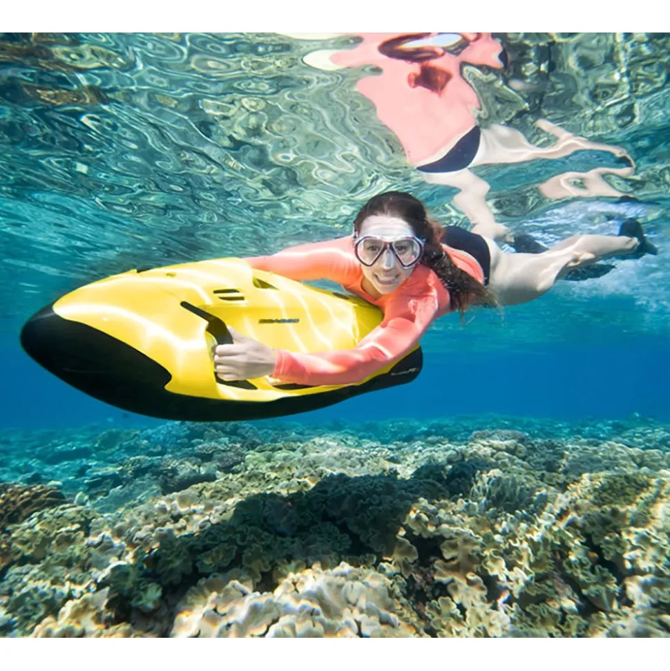 The Seabob is the world’s fastest underwater sports vehicle. The Seabob is a multi-purpose, lightweight, and fast-moving device. It weighs between 29 and 35 kg and has a top speed of 13 to 20 km/h. A single battery charge lasts around an hour, and the Seabob can go down to 40 metres (131 feet) below the surface.