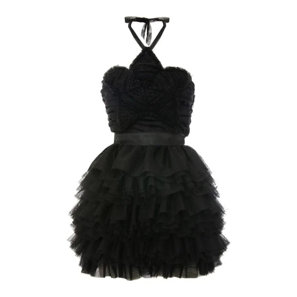 Mini dress in black tulle with front star in glittered tulle. Fastening behind the neck and zip on the center back. Tone-on-tone bow on the waist in grosgrain.