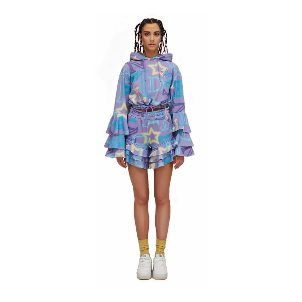 Printed fleece shorts with raw cut ruffles. Elastic and culisse at the waist.