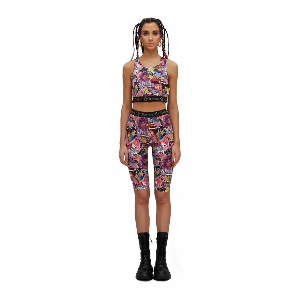 All-over printed cyclist in lycra. Available in color variant. Oversized fit.Teen Idol is a women’s clothing brand for a Teen-Ager audience by age and attitude. The collection mainly focuses on Mini dresses in fluttering tulle, along with t-shirts, shorts, sweatshirts, jumpsuits, skirts and jackets, all with an ultra-contemporary style. Each dress comes with a matching wig, our motto is “extensions are the new accessory”! Moreover, the dress collection is combined with other fun and ultra-glamorous accessories such as: scrunchies, hair clips, personalized chains… and much, much more. The atmosphere that Teen Idol is recreating is enchanting, like a doll’s world, brought to life thanks to special packaging inspired by the box of an iconic Blonde Doll, that magically opens revealing a playful and fun imagination space. Teen Idol is the new fashion icon for all Teen-Agers!