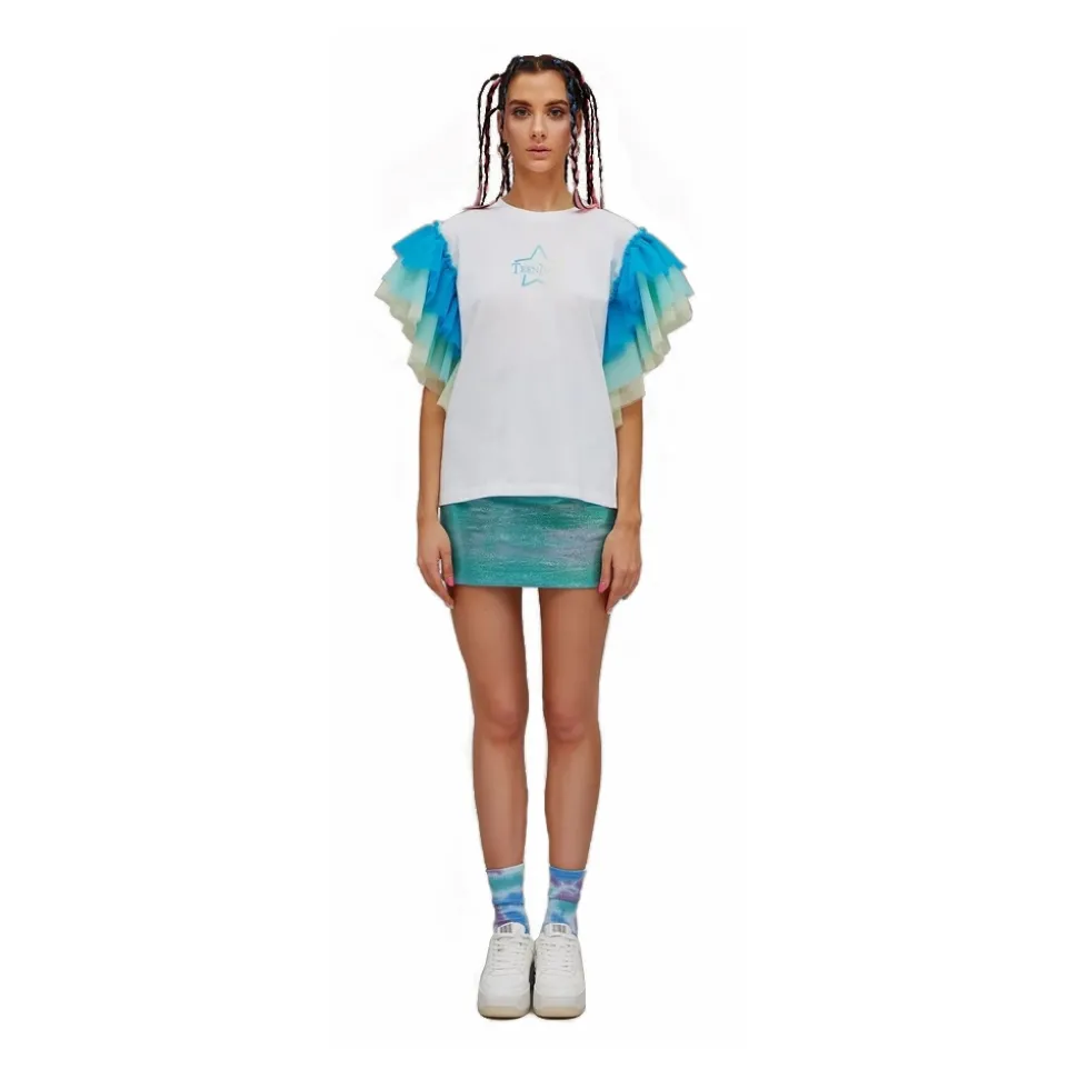Jersey T-shirt with tulle ruffles on the sleeves.