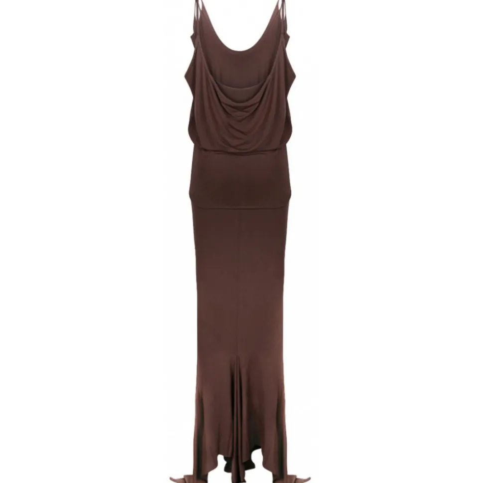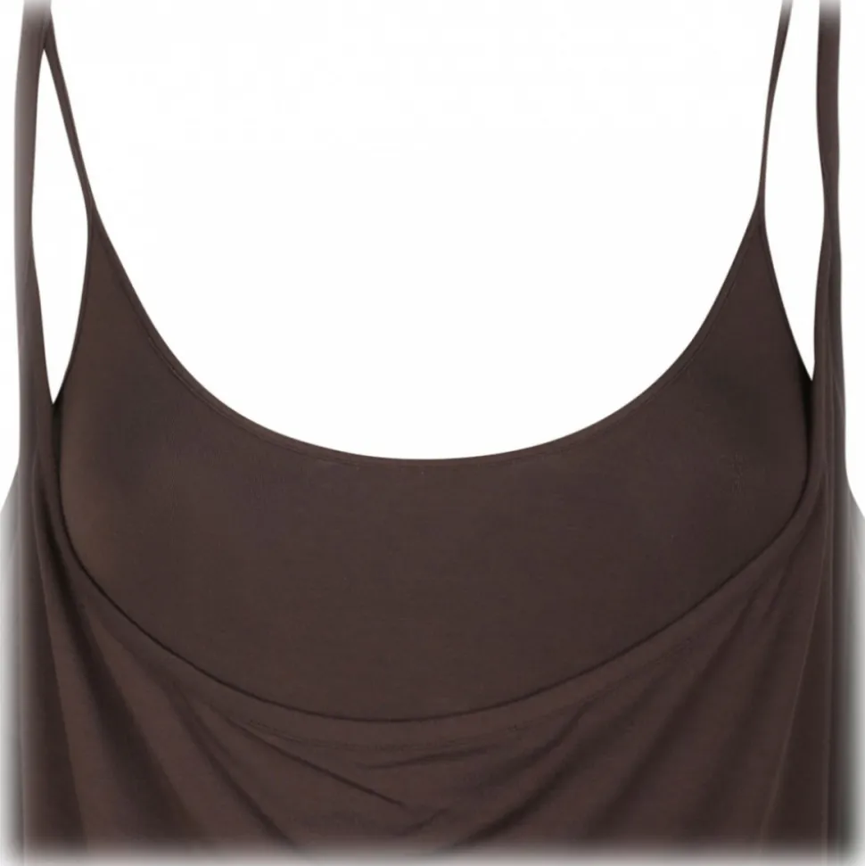 The Attico Layered Midi Dress. Cedar brown lightweight jersey midi dress, layered effect, round neck. Sleeveless, spaghetti straps, mid length, ruffle hem.