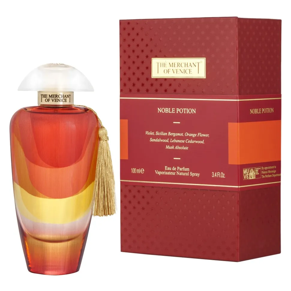 The fragrance Noble potion is confined in a bright flacon displaying a warm-yellow-to-red gradient pattern. Its design resembles the reddish golden colour of a warm sunset over the sea. It is completed with a golden tassel around its neck and an elegant white semi-transparent cap through which we can view the wind rose.