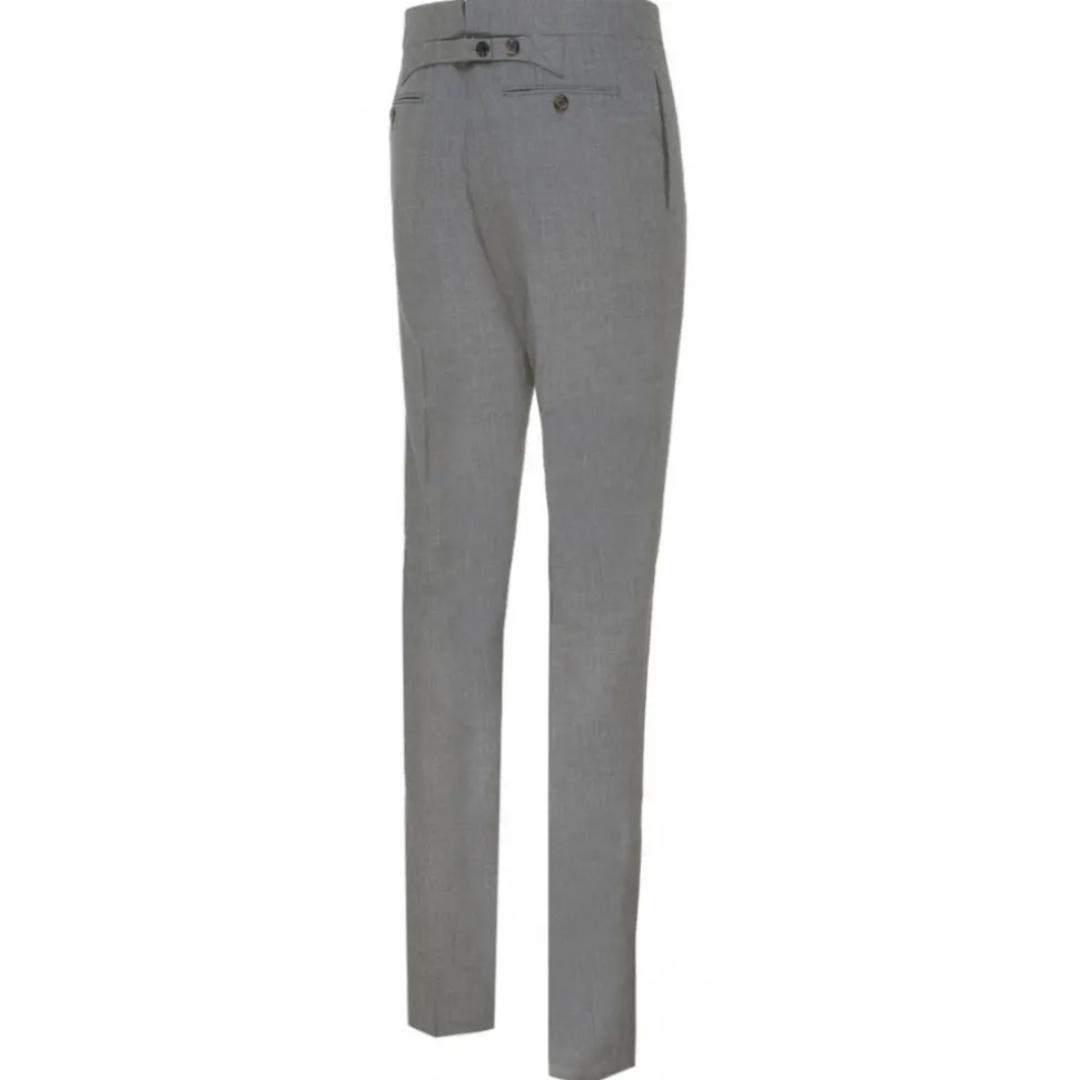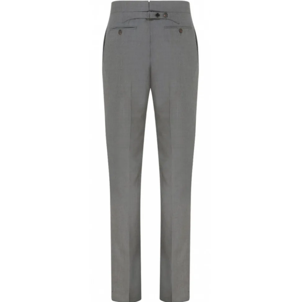 Thom Browne Medium Grey Tailored Trousers. Medium grey wool tailored trousers, adjustable buttoned strap to the back of the waist height, concealing the unforgettable grosgrain tab. Mid rise waistband, side slit pockets, two back buttoned welt pockets, a cropped length to a straight hem, a straight leg and a concealed button.