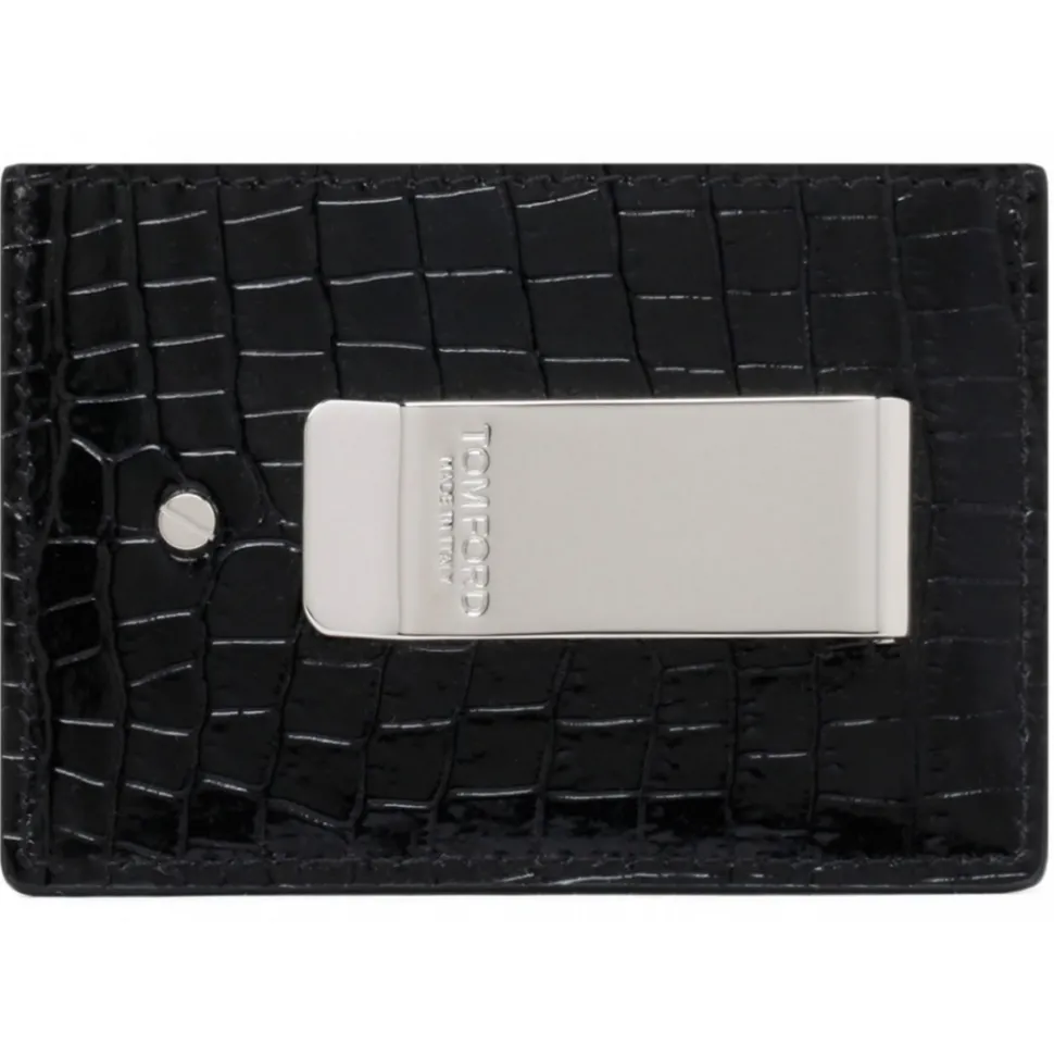 Tom Ford Black Calf Leather in Cocco Print Effect, printed logo in silver, 2 card slots and silver money clip on the back.