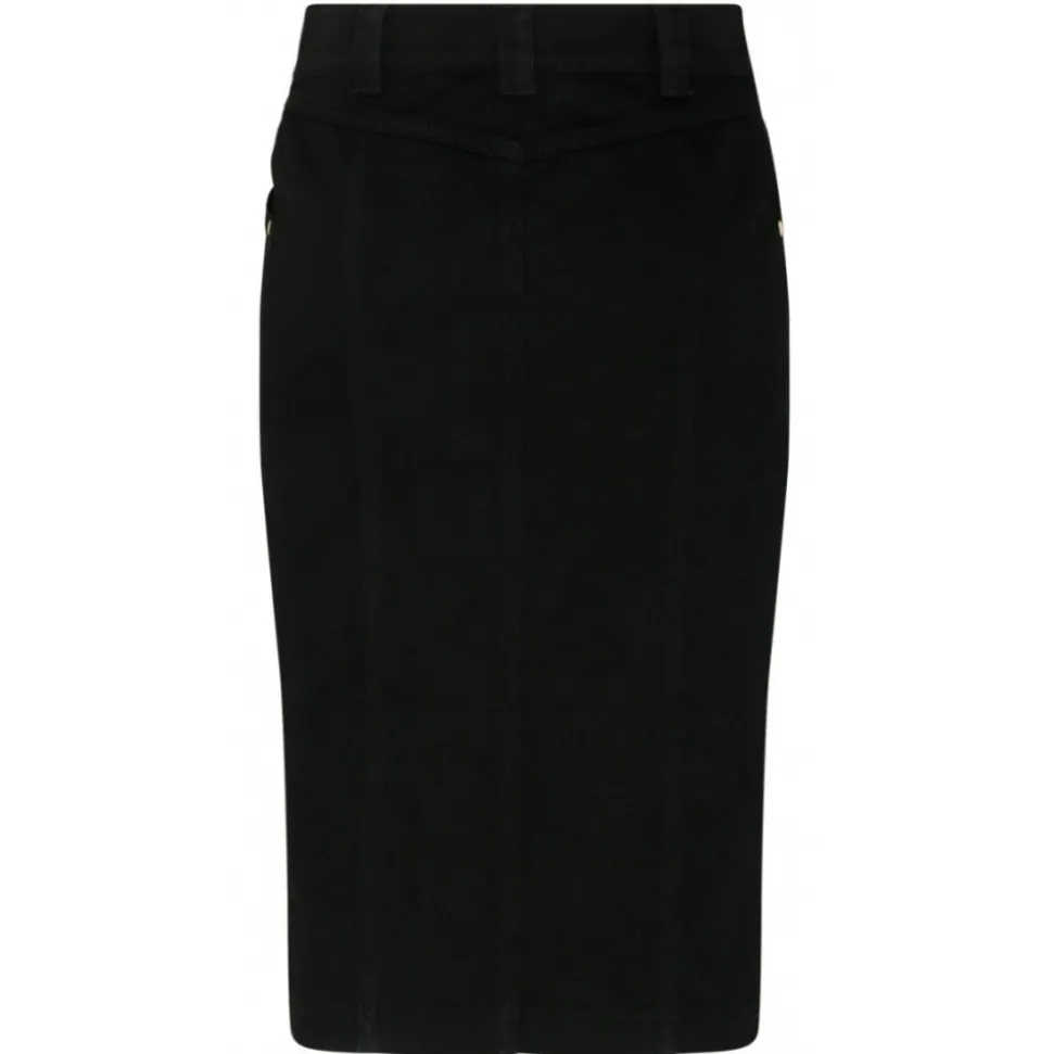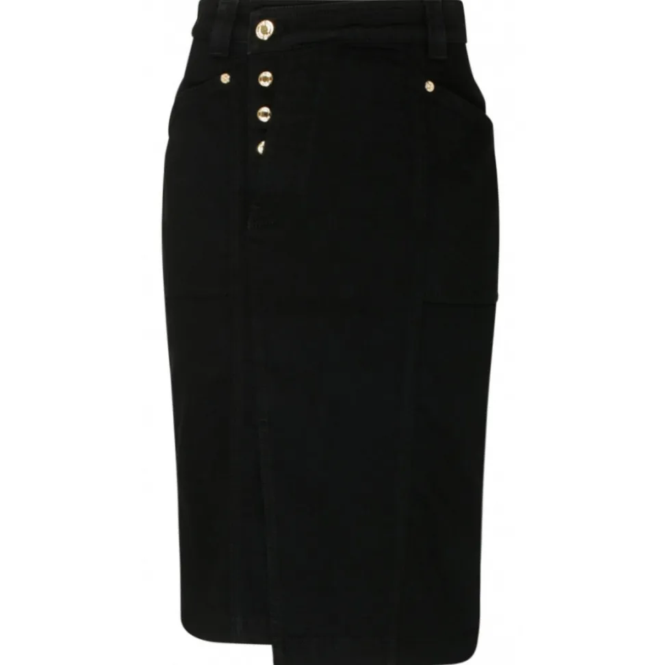 Tom Ford Black Cotton Blend Asymmetric Pencil Skirt. Black cotton blend pencil skirt, asymmetric front button fastening, asymmetric design, belt loops, embossed gold tone button, pencil silhouette.