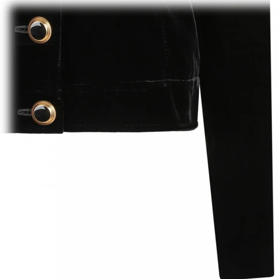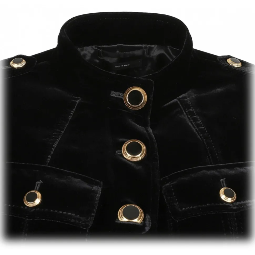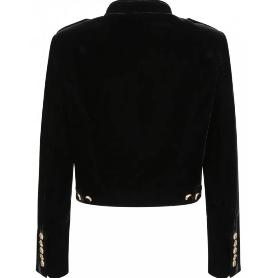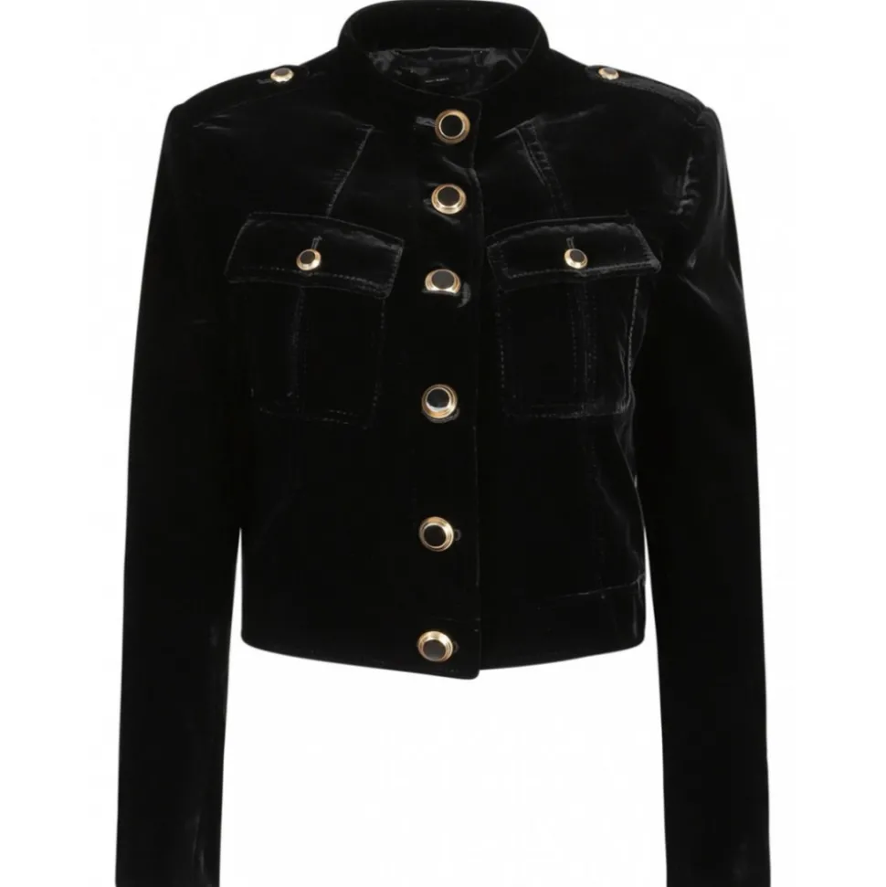 Tom Ford Black Cropped Jacket. Black cotton blend cropped jacket, velvet, band collar. Shoulder pads, front button fastening, gold tone buttons, two front flap pockets. Long sleeves, buttoned cuffs and straight hem.