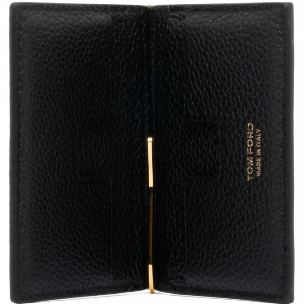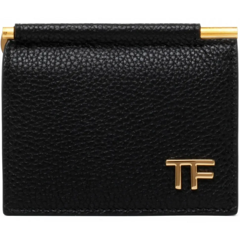 Tom Ford Black Logo Plaque Cardholder. Black leather cardholder, pebbled texture, bi fold design, gold tone logo plaque, debossed internal logo, money clip.
