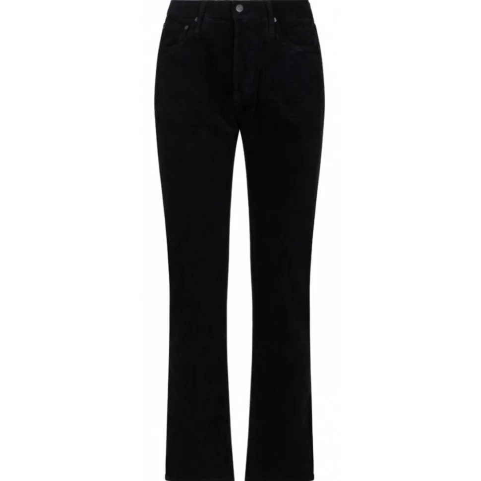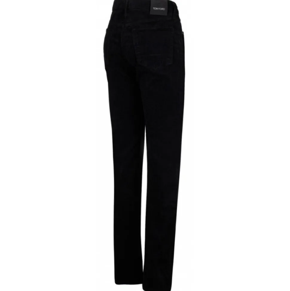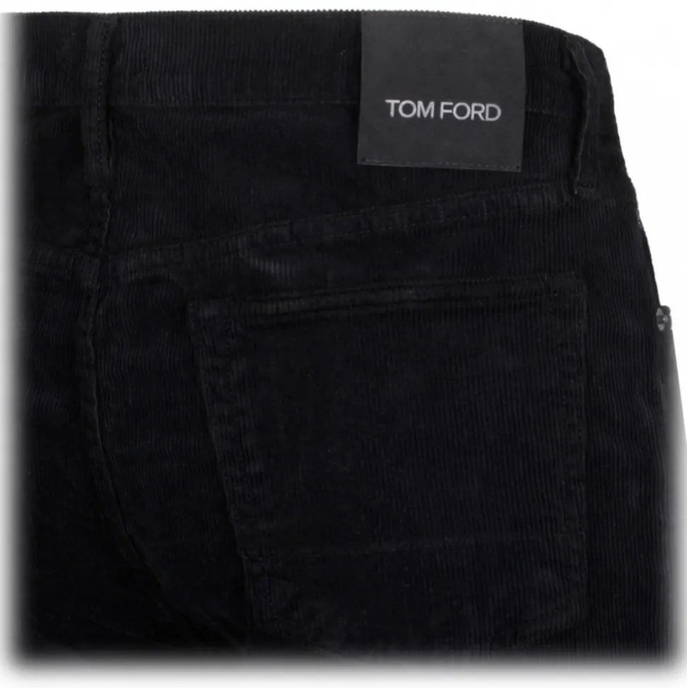 Tom Ford Black Standard Fit Jeans. Black 12 weaves cord jeans, brand signature tack button closure and rivets. Coin pocket on front right with Tom Ford label, T bar tack on button fly, brand leather back tab.