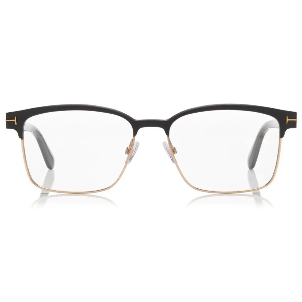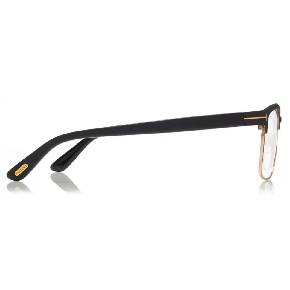 Matte black outer top and rose gold inner side metal front and shiny black acetate temples with rose gold metal T logo.
