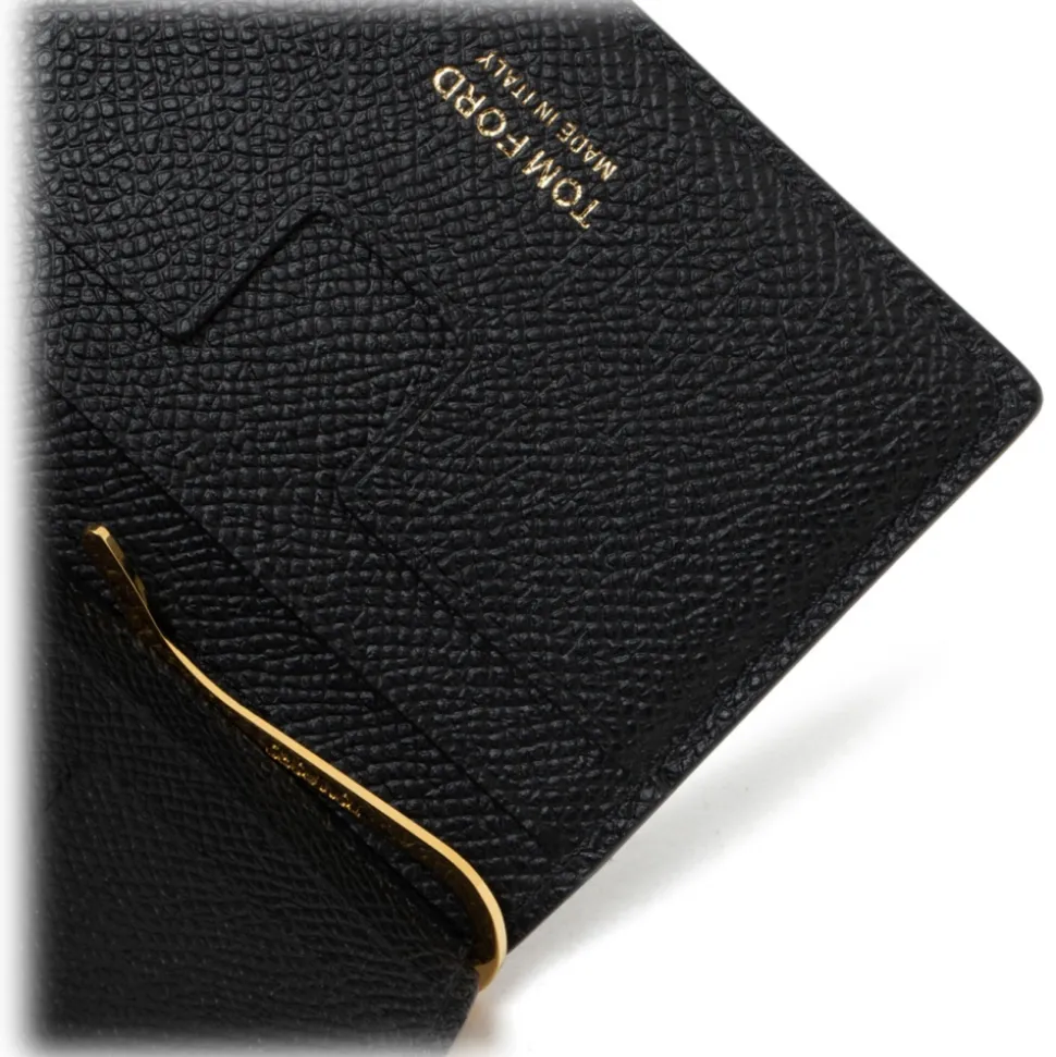 Tom Ford T Line Folding Money Clip Card Holder with one external and four internal card slots, money clip with TF engraved logo and TF gold hardware details.