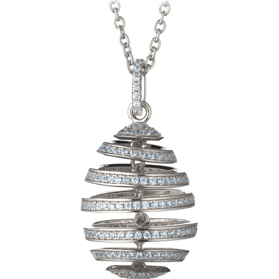 925 rose silver necklace with abstract egg-shaped pendant with blue zircons. The egg is represented as a sinuous mobile spiral, with parallel concentric segments.
