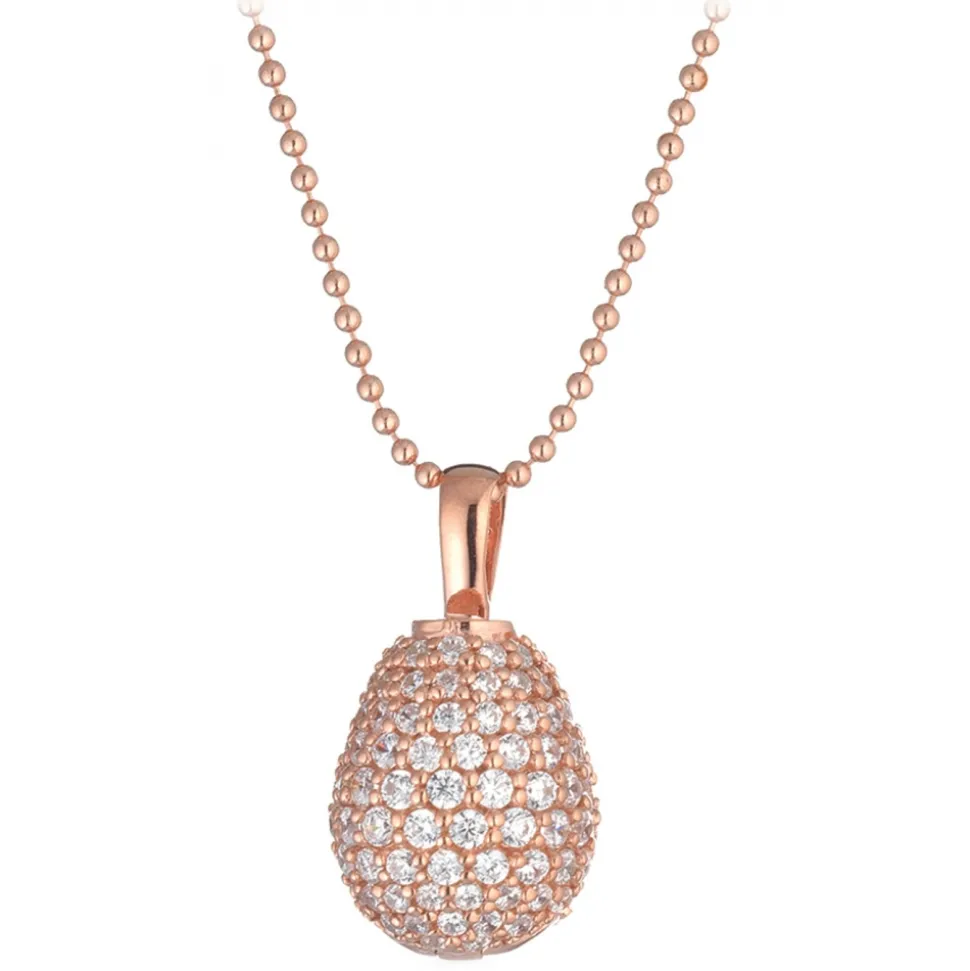 Rose silver necklace with openable egg pendant studded with white zircons.