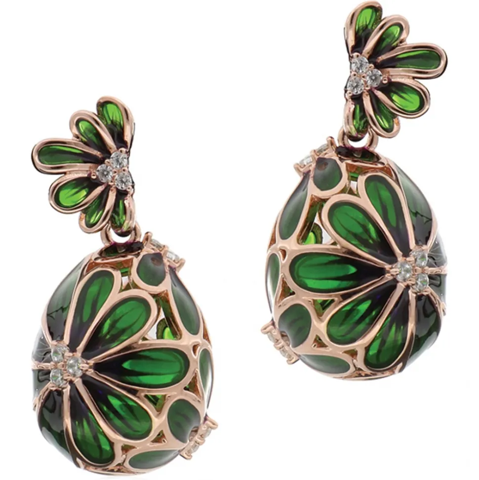 Pink silver earrings, egg-shaped pendant with enamel and floral designs in silver and zircons.