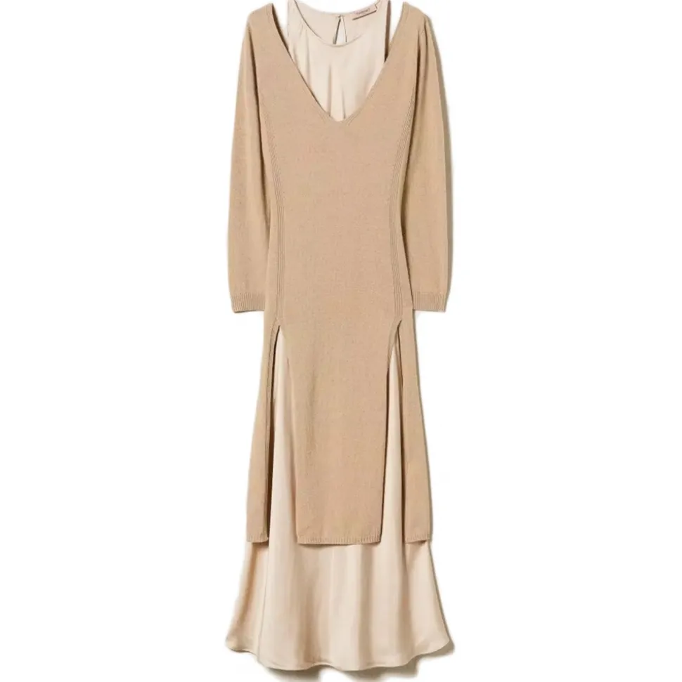 Twin Set seamless knit dress in wool and viscose blend with wide side slits and long viscose satin slip with round neckline.