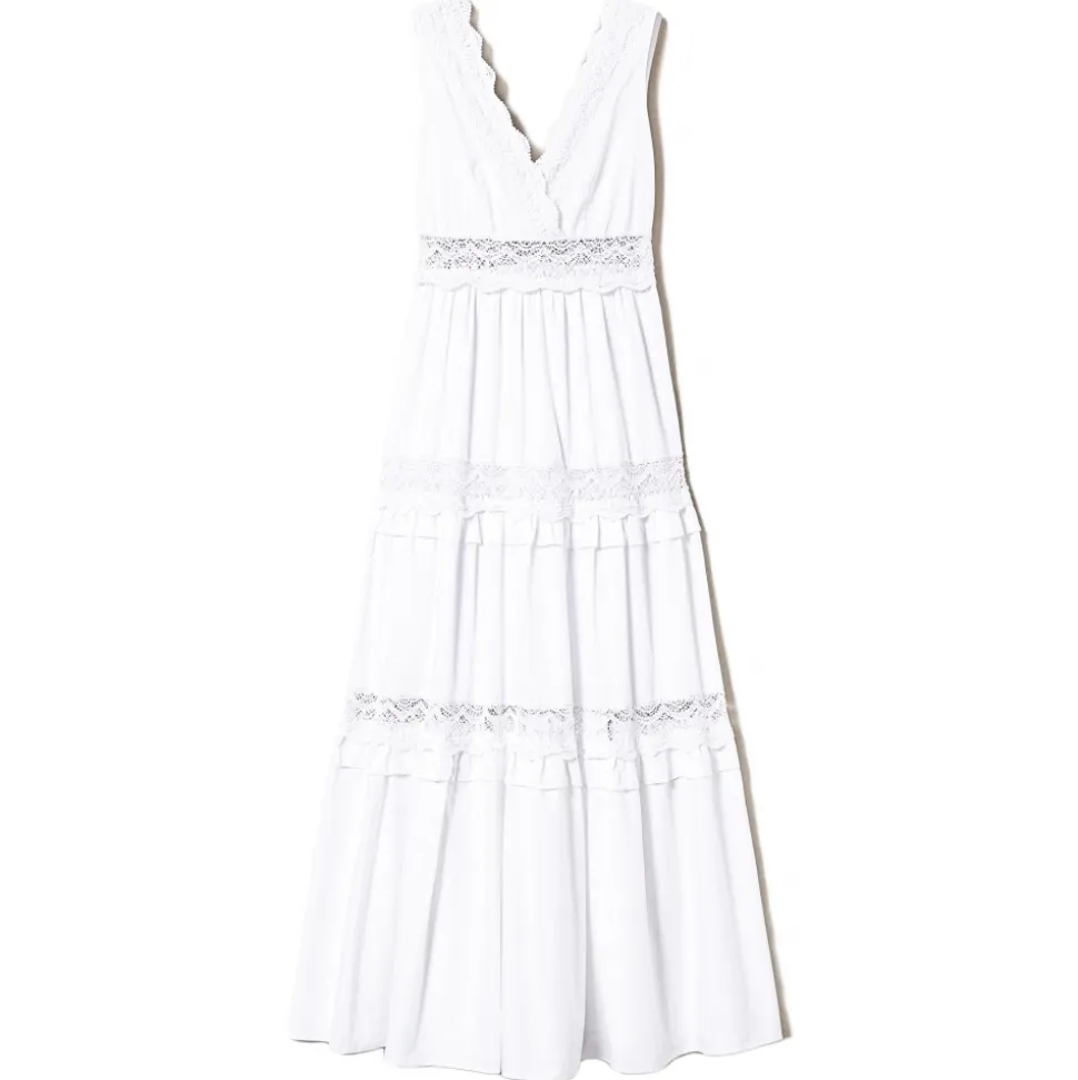 Twin Set dress, long model in light cotton poplin, with macramé lace edging and small ruffles, ‘V’ neckline with crossover, zip on the side.