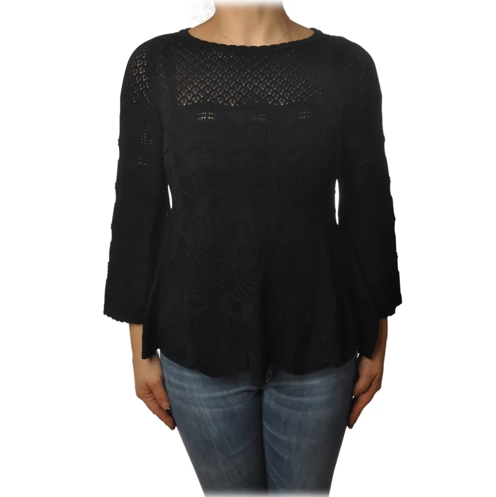Twinset – Openwork Sweater Flared Effect on the Bottom – Black – Knitwear – Made in Italy – Luxury Exclusive Collection