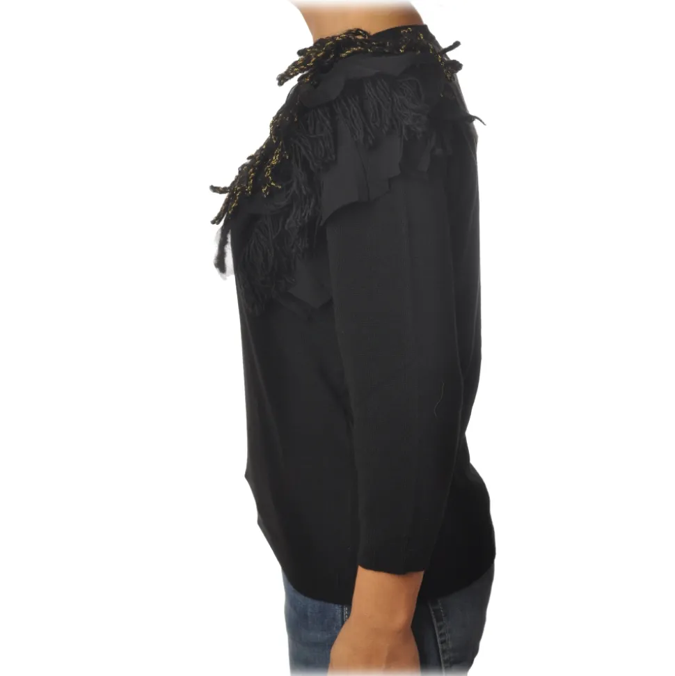 Twinset – V-neck Sweater with Fringes Detail – Black – Knitwear – Made in Italy – Luxury Exclusive Collection