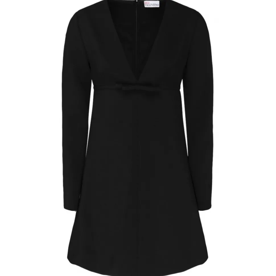 Red Valentino Black Bow Detail Crepe Mini Dress. Black crepe texture mini dress, bow detailing, V neck, long sleeves, A line skirt, concealed rear zip fastening.