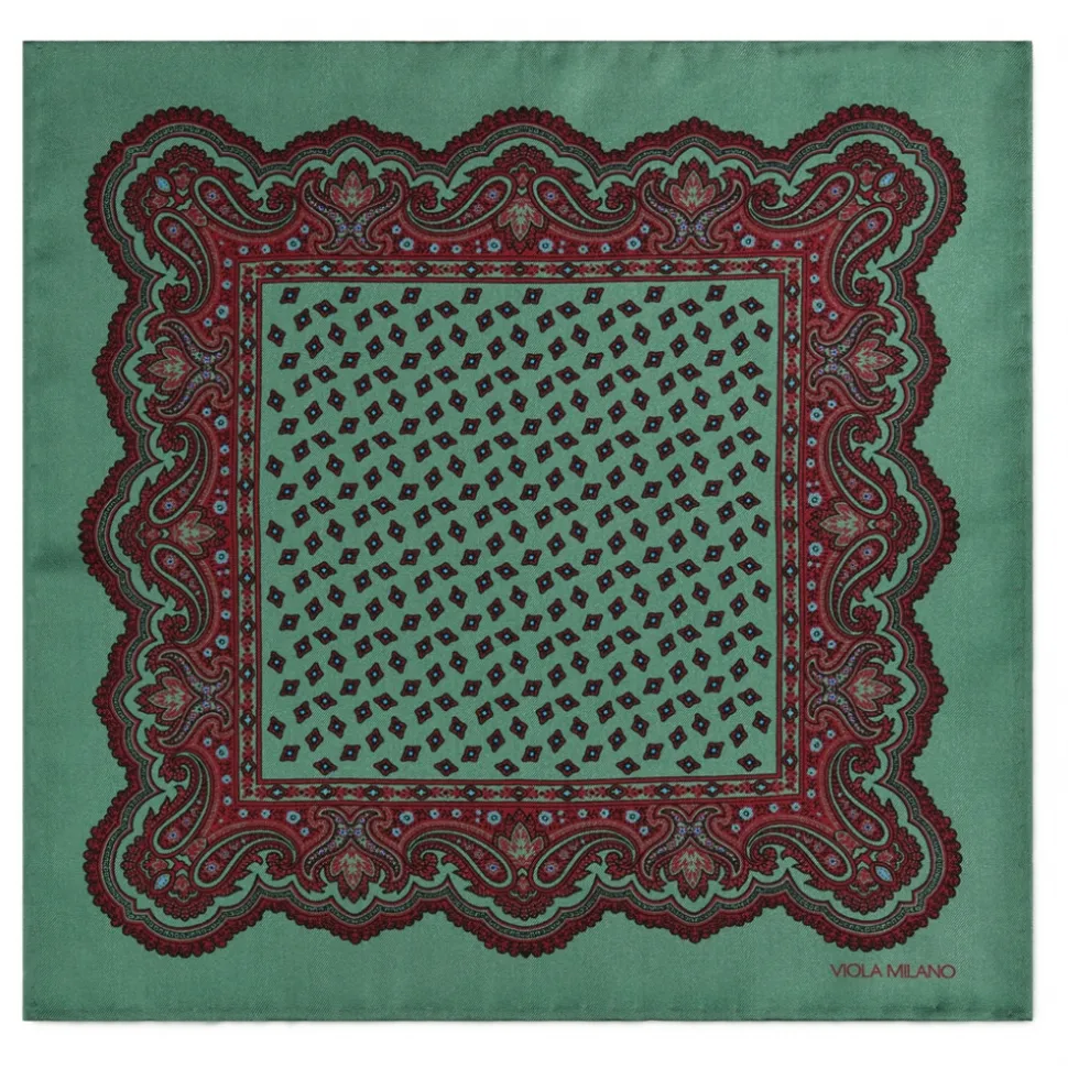 Viola Milano – Artisan Floral Printed Solid Silk Pocket Square – Green – Handmade in Italy – Luxury Exclusive Collection