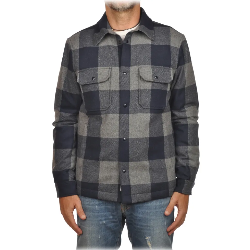Woolrich shirt, check pattern, made of recycled Italian wool, filled with duck down and lined with quilted nylon. Pointed collar and snap button pockets.