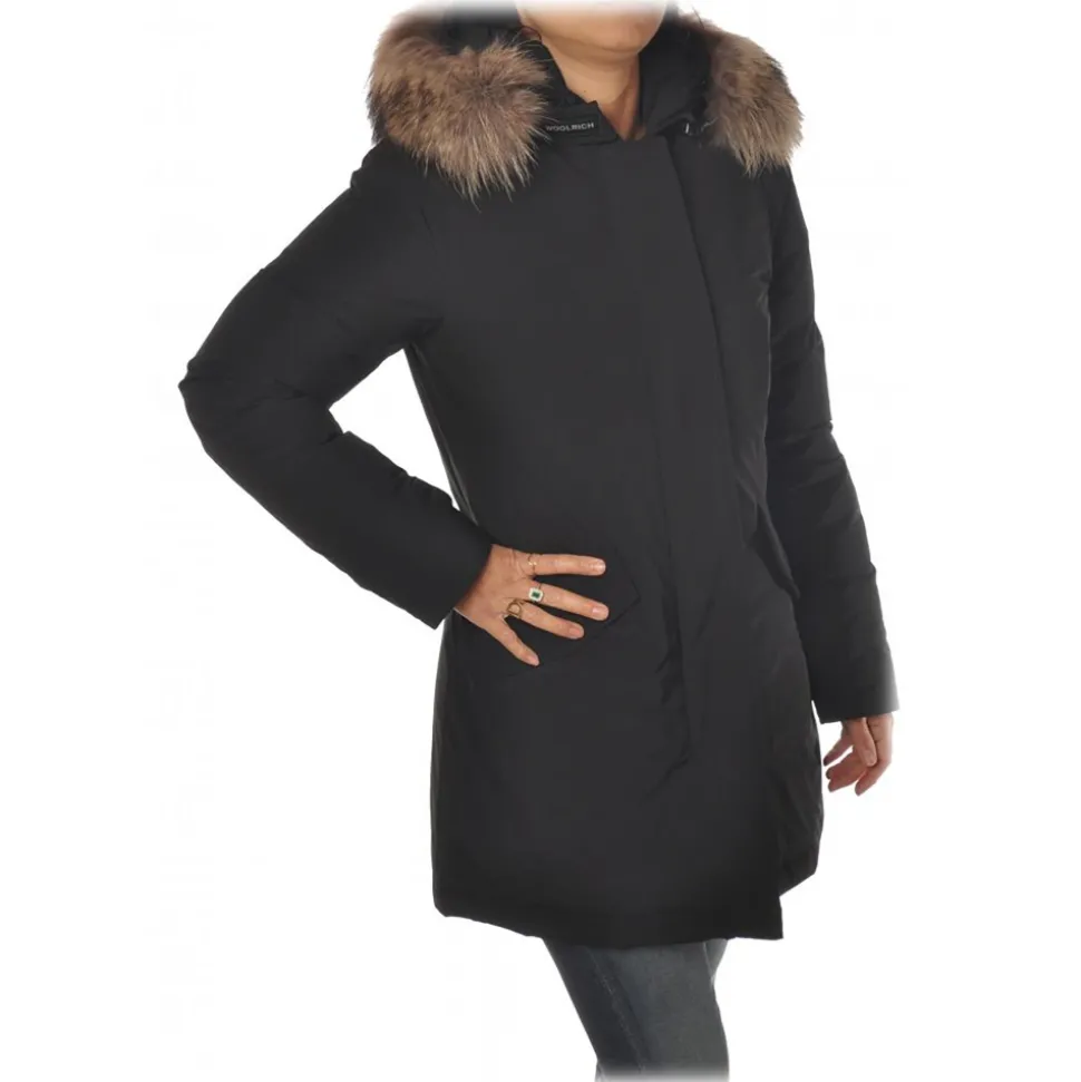 Woolrich down jacket, medium length, hood with detachable fur, close fitting, with front flap pockets plus zip fastening.