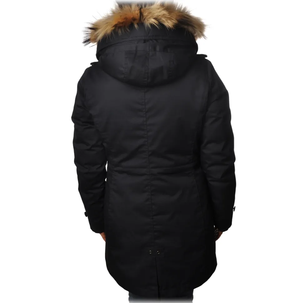 Parka down jacket above knee length with hood edged in contrasting fur, plus internal drawstring on the waist, made entirely with removable internal padding, Woolrich.