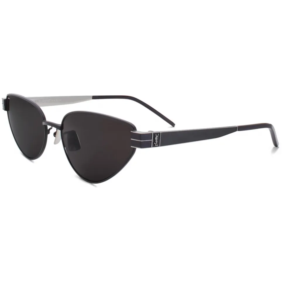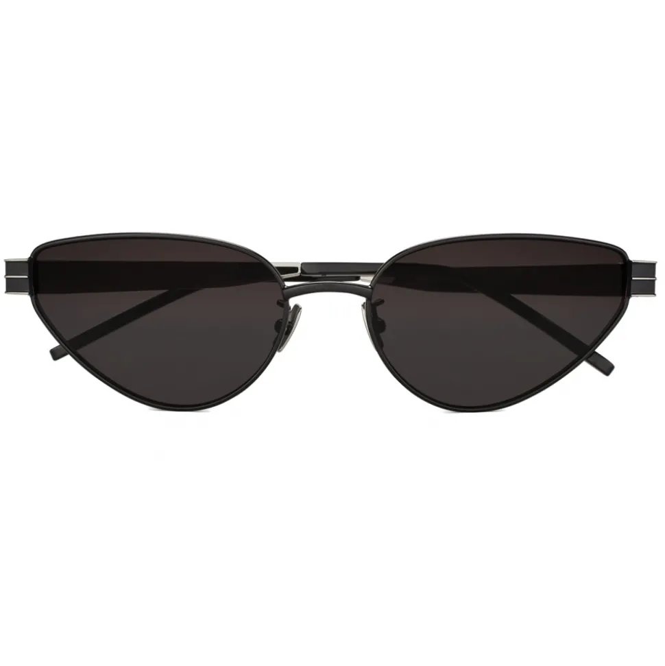 Sunglasses with metal and enamel triangular frames and nylon lenses.